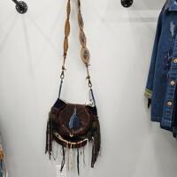 This is a one of a kind crossbody boho handbag. It measures 14" x 14" with a 3" gold fringe. It is embellished with a brooch from the 1940s and a chain and bead tassel. Whether your looking to dress up a pair of jeans or accentuate a flowy dress, the deep, rich brown of this bag will go with anything.